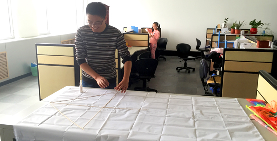 上午9点,,,,,,加入运动的同事们都准时抵达了监控大厅。。。。。。。在简朴解说了鹞子的制作要领和注重事项后,,,,,,各小组领取了竹签、鹞子布、胶水、颜料、线轴等质料,,,,,,最先创作自己的鹞子作品。。。。。。。创作历程中,,,,,,各人围绕“创意无限”的主题,,,,,,充分展示小我私家气概和DIY功底。。。。。。。有唯美的蝴蝶鹞子,,,,,,有可爱的卡通人物鹞子,,,,,,尚有完全解放头脑的涂鸦气概。。。。。。。各小组制作完成后,,,,,,经由在监控大厅鹞子工艺与创意的评选,,,,,,各人一致以为软件手艺中心的“花蝴蝶”绘画最是细腻,,,,,,也获得了该环节的最高分。。。。。。。